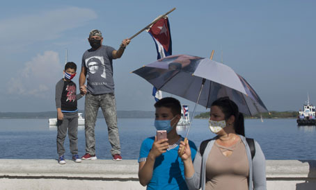 ▲ Medio centenar de embarcaciones surcaron ayer la Bahía de Cienfuegos, en el centro de Cuba, acompañadas en la costa por motociclistas y un grupo de jóvenes, en una nueva caravana para exigir el levantamiento del bloqueo de Estados Unidos, el cual fue endurecido durante la pandemia. Cuba reclamó el viernes no poder producir las dosis de vacunas que requiere su población por esa medida. En la Ciudad de México hubo un plantón frente a la embajada estadunidense contra el embargo. Foto Ap. Agencias y Emir Olivares