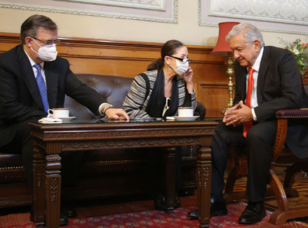 ▲ El presidente Andrés Manuel López Obrador, acompañado del canciller Marcelo Ebrard y una traductora, sostuvo ayer una conversación telefónica con la vicepresidenta estadunidense, quien le informó que su país enviará a México un millón de dosis de la vacuna Johnson & Johnson de una sola aplicación. Foto Presidencia. / Fabiols Marínez y Roberto Garduño