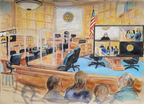 ▲ Recreación del tribunal en Washington donde fue procesada la esposa del capo mexicano. Emma Coronel aceptó que era culpable de narcotráfico, lavado de dinero y manejo de transacciones y negocios de su cónyuge. Reconoció que existe un acuerdo de culpabilidad que negoció con fiscales estadunidenses, pero el juez Rudolph Contreras no le garantizó una pena reducida. Le informó que en el primer cargo la sentencia máxima es de cadena perpetua, además de multas de hasta 10 millones de dólares. Foto Ap. / David Brooks, corresponsal