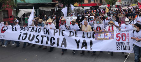 ▲ Integrantes del Comité 68 encabezaron la marcha de miles de personas que conmemoraron la matanza del Jueves de Corpus, el 10 de junio de 1971, cuando el grupo paramilitar halcones arremetió contra una movilización estudiantil en San Cosme. Foto Luis Castillo