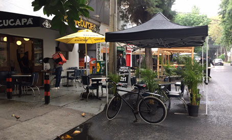 ▲ Los espacios de estacionamiento destinados para vehículos que transportan personas con discapacidad han sido eliminados e invadidos por este tipo de negocios en la colonia de la alcaldía Benito Juárez. Lo mismo ocurre con lugares para emergencias, que se identifican con líneas amarillas. Esto sucede en las calles de Kansas y Nueva York, donde restaurantes cobran 50 pesos por el servicio de valet parking. Vecinos señalaron que las autoridades han sido omisas ante este problema. Foto Cristina Rodríguez. Laura Gómez Flores