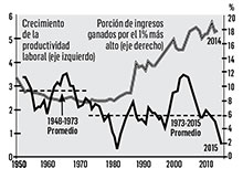 Sin incremento de la inversión no hay aumento del empleo, ni de la productividad; todo lo cual, a su vez, induce el crecimiento del producto. La inversión, a su turno, depende de los niveles de rentabilidad que, en el largo plazo, mantienen una tendencia a la baja en los países centrales. Debido a la tendencia a la baja inversión productiva, la productividad declina (a pesar de la jactancia de las empresas tecnológicas) y el ingreso tiende al estancamiento. Por tanto, el crecimiento del ingreso de los de arriba sólo es posible mediante el aumento de la desigualdad, como lo muestran las tendencias de largo plazo del Bureau of Labor Statistics. Productivity and Costs. World Wealth and Income Database, para las principales economías: