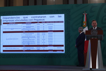 ▲ Santiago Nieto, titular de la Unidad de Inteligencia Financiera, detalla en la mañanera del presidente Andrés Manuel López Obrador el entramado de empresas fachada que se utilizó para la compra del software Pegasus a la firma israelí NSO, el cual fue usado por el gobierno de Enrique Peña Nieto, según revelaciones, para espiar a unas 15 mil personas. Foto Yazmín Ortega Cortés