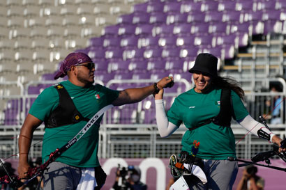 ▲ Alejandra Valencia y Luis Álvarez se impusieron 6-2 a los turcos Yasemin Anagoz y Mete Gazoz en la prueba mixta que aparece por primera vez en el programa olímpico, luego de que el mexicano disparó una flecha de dos puntos, error que permitió a sus rivales empatar 2-2, pero su compañera lo condujo para ganar los siguientes sets y llevarse la presea de bronce. Mientras, la selección nacional de softbol sumó su tercera derrota frente a Estados Unidos por 2-0 y le quedan dos juegos más con la obligación de ganar para subirse al podio; la tenista Renata Zarazúa se despidió de la competencia de singles al sucumbir frente a la japonesa Misaki Doi. Foto Ap / Agencias
