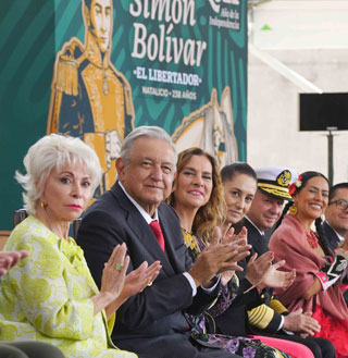 ▲ Durante la ceremonia en el Castillo de Chapultepec por el 238 aniversario del natalicio de Simón Bolívar, López Obrador llamó a mantener vivo el espíritu de El Libertador. En la imagen, con la escritora Isabel Allende; su esposa, Beatriz Gutiérrez; la jefa de Gobierno, Claudia Sheinbaum; el titular de la Marina, Rafael Ojeda, y Lila Downs, entre otros. Foto Presidencia