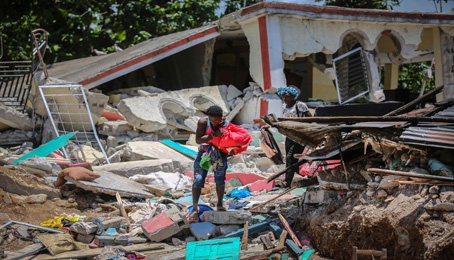 ▲ Tras una noche de réplicas, residentes y rescatistas se esforzaban por encontrar sobrevivientes bajo los escombros en poblados del suroeste del país caribeño antes del arribo de una tormenta tropical. Las autoridades actualizaron a más de 5 mil 700 la cantidad de heridos. El sismo destruyó cientos de casas y edificios, sobre todo en Les Cayes. México envió ayer dos vuelos con ayuda humanitaria, que incluye medicamentos y víveres, informó el canciller Marcelo Ebrard. Foto Ap. Agencias y Redacción