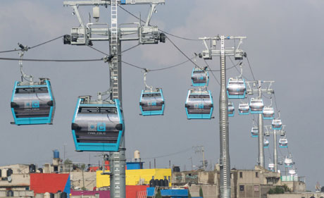 ▲ La línea 2, que va de Constitución de 1917 a Santa Martha, fue reconocida por ser el teleférico con uso de transporte urbano más largo del mundo. Con una longitud de 10.55 kilómetros, tiene siete estaciones y 305 cabinas, en las cuales se transportan 49 mil usuarios al día en promedio, informó el secretario de Movilidad de la Ciudad de México, Andrés Lajous Loaeza. Recibió el premio la jefa de Gobierno, Claudia Sheinbaum, quien expresó que su administración trabaja por una urbe de vanguardia a escala internacional, por lo que el próximo paso es que cuente con el mayor número de puntos de conexión wifi gratuitos. Foto Pablo Ramos / Alejandro Cruz Flores