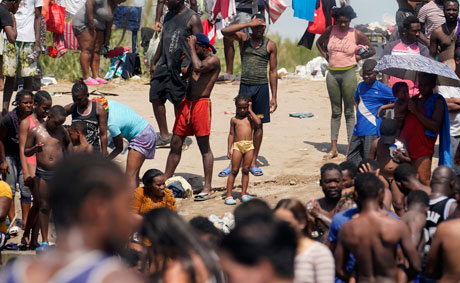▲ Migrantes haitianos que cruzaron en los últimos días a Del Río, Texas, esperan ser detenidos para empezar trámites de solicitud de asilo, según funcionarios estadunidenses. Montaron carpas y construyeron refugios improvisados con carrizo, se bañaron y lavaron ropa en el afluente, mientras autoridades aseguran que repartieron agua y toallas e instalaron sanitarios portátiles. Prevén realizar de cinco a ocho vuelos diarios a partir de mañana para regresarlos a su país. Foto Ap.