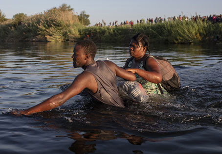 ▲ Una pareja de caribeños cruza el río Bravo para retornar a Ciudad Acuña, Coahuila, ante las acciones del gobierno estadunidense para repatriar a miles de migrantes que fueron retenidos en Del Rio, Texas. Más de 6 mil indocumentados fueron retirados de un campamento en esa localidad. Alejandro Mayorkas, secretario de Seguridad Nacional, dijo que es una situación