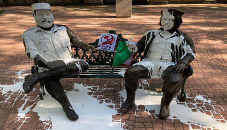 ▲ La obra, denominada Monumento del encuentro, se halla en el parque Tabacalera, alcaldía Cuauhtémoc. Autoridades señalaron que dos personas fueron detenidas por arrojarle pintura blanca. Además dejaron una bandera de México y una hoja con el símbolo del comunismo de la hoz y el martillo, así como la señal de prohibido con la frase