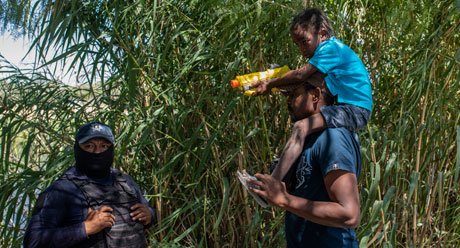 La manera de enfrentar a los traficantes de personas es frenar la migración forzada vinculada a la pobreza y la violencia, ratificó ayer el presidente Andrés Manuel López Obrador ante la crisis que se vive en las fronteras norte y sur del país, donde cientos de migrantes, principalmente haitianos, buscan cruzar a Estados Unidos o permanecer en México para mejorar sus condiciones de vida. El comisionado del INM, Francisco Garduño, aseguró que revisarán cada caso y sólo se deportará a quienes lo soliciten. En la imagen, un haitiano platica con un elemento de seguridad en Ciudad Acuña, en el cruce hacia Del Río, Texas, mientras su hijo juega con un rifle de agua. Foto Ap