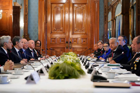 ▲ El presidente Andrés Manuel López Obrador recibió ayer en Palacio Nacional al secretario de Estado, Antony Blinken. Antes del desayuno de trabajo entre ambas delegaciones (imagen) lo condujo a la escalinata principal, que alberga los 276 metros cuadrados de Epopeya del pueblo mexicano, de Diego Rivera, para compartirle su perspectiva de la historia de México, en particular sobre la relación bilateral, como detalló más tarde el emisario de Joe Biden en el salón Leona Vicario, donde hablaron de migración, economía, Covid y crisis climática. El Ejecutivo mexicano ratificó la invitación a su par estadunidense a visitar el país. Foto Afp