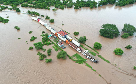 ▲ Cientos de familias perdieron sus bienes por las inundaciones de hasta dos metros de altura que dejó en Tuxpan, Nayarit, el desbordamiento del río San Pedro, el cual incrementó su corriente por las lluvias torrenciales que causó el huracán tras tocar tierra la mañana del miércoles en Sinaloa. La carretera Tepic-Villa Unión (imagen) siguió intransitable al salirse de su cauce el río Acaponeta. En la imagen se aprecia la caseta de peaje Tecuala. Foto Secretaría de Seguridad y Protección Ciudadana de Nayarit. / Corresponsales