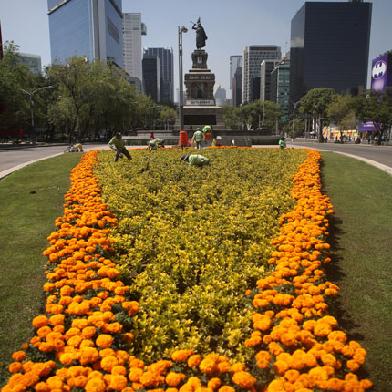 ▲ En camellones y áreas verdes de las principales avenidas de la Ciudad de México, como Reforma (imagen), trabajadores del gobierno plantan 260 mil flores de cempasúchil cultivadas en Xochimilco, como parte de las festividades por el Día de Muertos, que incluirán una ruta agroturística denominada Flores del Mictlán. Foto Yazmín Ortega Cortés / Rocío González Alvarado