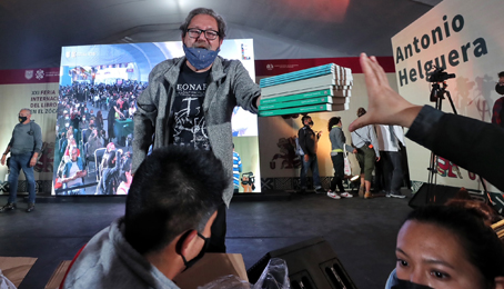▲ Paco Ignacio Taibo II, director del Fondo de Cultura Económica, regala libros durante la ceremonia de clausura. Paloma Saiz Tejero, directora del encuentro editoral, informó que se vendieron 250 mil ejemplares, lo cual rebasa la edición 2019. Es el primer acto masivo que hacemos y es la mejor manera de celebrar que empecemos a volver a la normalidad. Foto Marco Peláez. Reyes Martínez