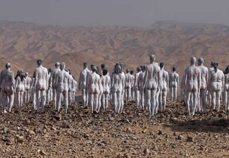 ▲ Unas 300 personas desnudas, pintadas de blanco, participaron en el proyecto del fotógrafo estadunidense en una zona desértica cerca del lago salado, en Arad, Israel. La reducción paulatina del Mar Muerto se ha agravado debido a que este último país y Jordania han usado el agua para la agricultura o como bebida, a lo que se agrega la acelerada evaporación por el cambio climático. Dijo que usó ese tono en los modelos para evocar la historia bíblica de la esposa de Lot, quien se convirtió en estatua de sal. Foto Afp. Agencias