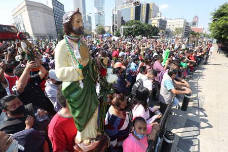 ▲ Miles de personas acudieron ayer a la iglesia de San Hipólito y San Casiano, ubicada en el cruce de Paseo de la Reforma y avenida Hidalgo, alcaldía Cuauhtémoc, para solicitar al santo patrono de las causas perdidas que los ayude a curar alguna enfermedad o a encontrar empleo. La Secretaría de Seguridad Ciudadana aplicó un gran dispositivo de vigilancia ante la masiva afluencia, en la que no se respetó la sana distancia por la pandemia del Covid-19. Foto Luis Castillo. / Laura Gómez Flores