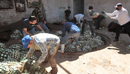 ▲ Las piñas son colocadas en hornos bajo tierra recubiertos de piedra volcánica y calentados durante horas para tatemar las preciadas piezas. Más tarde, son maceradas para que sus jugos tequileros pasen a un proceso de fermentación natural en barricas y posterior destilación. La tequilera Cascahuin utiliza esta técnica y, a decir de David Suro-Piñera, impulsor del proyecto, la idea no es vender millones de litros, sino rescatar las tradiciones para producir la