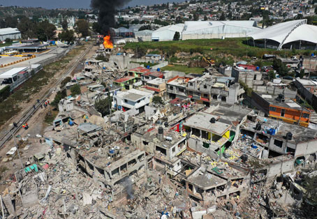 ▲ Tres explosiones ocurridas en la madrugada de ayer en San Pablo Xochimehuacán, en la capital poblana, provocaron también la destrucción de 54 viviendas, reportó el gobernador Miguel Barbosa. El desastre presuntamente se debió a la extracción de hidrocarburos obtenidos de tomas clandestinas en ductos de Pemex. Pobladores dieron la alerta sobre un fuerte olor a gas y una nube blanca en la zona; autoridades ordenaron de inmediato el desalojo de habitantes. El presidente Andrés Manuel López Obrador lamentó el incidente e informó que se enviaron mil 396 integrantes de Protección Civil al lugar siniestrado. Foto Afp. La Jornada de Oriente