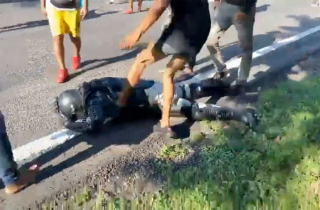 ▲ En la marcha hacia Tonalá, Chiapas, los movilizados chocaron en al menos cuatro ocasiones con los agentes federales, quienes trataron de impedir que continuara la caravana, con saldo de varios heridos por ambos lados. Luis García Villagrán, director del Centro de Dignificación Humana, dijo que la gresca comenzó cuando se intentó detener a mujeres y niños rezagados. La Guardia Nacional reportó lesionados a cinco de sus miembros; uno fue pateado al caer. Foto tomada de video en Twitter. E. Henríquez y G. Castillo