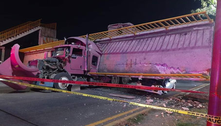▲ El percance ocurrió en la carretera federal Los Reyes-Texcoco, a la altura del poblado Cuautlalpan, estado de México. Todo indica que el vehículo, un Kenworth placas 29AF6W, excedió las dimensiones reglamentarias, colisionó con la estructura superior, la cual colapsó y cayó sobre el tractocamión y un taxi sedán. Las autoridades locales reportaron que Diego Barrera, conductor de la unidad de carga, fue hospitalizado. Foto tomada de redes sociales. Javier Salinas Cesáreo, Corresponsal