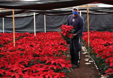 ▲ Para floricultores de Xochimilco la pandemia sigue como motivo de incertidumbre, ya que este año algunos invirtieron 50 por ciento menos en la producción. David Cázares (imagen) prefirió sembrar 10 mil de las 20 mil plantas ornamentales que acostumbra para no arriesgar su inversión: vivimos una situación muy pesada debido a que los costos suben cada vez más. Macetas e insumos van para arriba y el precio de la nochebuena siempre lo quieren barato, narró. Foto Yazmín Ortega Cortés. Sandra Hernández
