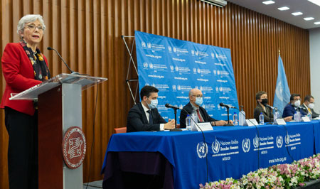 Las personas con quienes conversamos nos transmitieron la imagen de una sociedad superada por el fenómeno de las desapariciones y su impotencia frente a la inacción de algunas autoridades, expuso la jefa de la delegación del Comité de la Organización de Naciones Unidas contra la Desaparición Forzada, Carmen Rosa Villa (al micrófono), al concluir su visita al país. Se refirió a los 95 mil 121 desaparecidos en México, donde ha aumentado notablemente el número de niñas, niños, adolescentes y mujeres víctimas de ese flagelo, así como a la grave crisis forense, con más de 52 mil cuerpos sin identificar. Foto Pablo Ramos