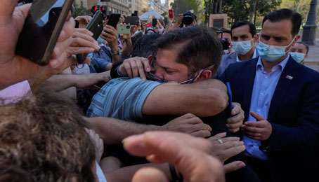 ▲ Tras su contundente triunfo electoral, el mandatario electo es felicitado por simpatizantes tras salir de una reunión de dos horas con el presidente Sebastián Piñera, en la cual acordaron los pasos para la transferencia del poder. El político de 35 años buscó tranquilizar los mercados financieros, los cuales cerraron con abruptas pérdidas por su victoria, al exponer que el país requiere cuentas claras y una macroeconomía ordenada. Foto Ap. Aldo Anfossi, Especial para La Jornada