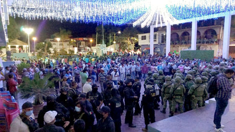 ▲ Habitantes de Quechultenango, ubicado en el centro del estado, retuvieron durante cinco horas a 30 soldados y 10 policías ministeriales que realizaban un operativo en la región, así como a 20 reporteros. A las 23 horas arribó el secretario de Seguridad Pública, Evelio Martínez, y se firmó una minuta de acuerdos, que incluye la liberación de Jesús Flores, detenido por portar una arma de fuego. La localidad está en la región en la que opera el grupo delincuencial de Los Ardillos. Foto La Jornada. / De la Redacción