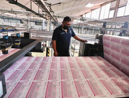 ▲ Ayer comenzó el tiraje de 94 millones 590 mil boletas en las instalaciones de los Talleres Gráfi cos de la Nación. En la ceremonia respectiva, el consejero presidente del Instituto Nacional Electoral, Lorenzo Córdova, afirmó que, pese a las restricciones presupuestales, se aplican medidas para evitar su falsificación. Foto Luis Castillo. / Jessica Xantomila