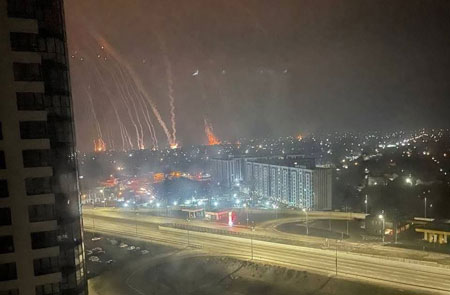 ¿Qué hemos hecho?, preguntaban habitantes de Kiev mientras huían a un refugio improvisado para protegerse de los bombardeos de Rusia, que en las primeras horas del jueves arrasaron con el aeródromo de Hostomel y otras obras de infraestructura. En tanto, en al menos 53 ciudades de Rusia hubo protestas por la invasión, con saldo de mil 700 detenidos, la mayoría en Moscú y San Petersburgo. En la imagen, ataque en la madrugada de hoy a la capital de Ucrania con misiles de crucero o balísticos, informó Zelensky. Foto tomada de Twitter