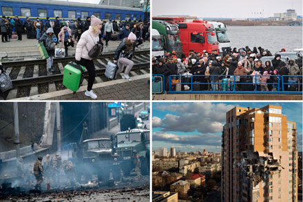 ▲ Alrededor de 150 mil personas abandonaron Ucrania ante la incursión militar rusa –la mayoría fue a Polonia–, mientras a diario miles intentan escapar por mar y tierra, afi rma el Alto Comisionado de la ONU para refugiados. En las imágenes de arriba, huida en tren desde la ciudad de Leópolis (izquierda) y llegada a Rumania (derecha). Abajo, aspectos de los combates en la capital Kiev. Fotos Ap y Afp