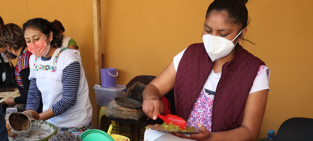 ▲ La decisión de vender en la inauguración del nuevo aeropuerto de Santa Lucía me hizo famosa, admite entre risas la joven madre de cuatro niños, cuyo negocio ha mantenido a su familia desde hace más de tres lustros. Invitada por la Secretaría de Cultura, ayer y hoy expende sus tostadas de maíz azul en el Complejo Cultural. El platillo típico lleva una cama de frijol y encima nopales, cilantro y queso, a un precio de 35 pesos cada una. La mujer pide al Presidente que le dé un lugar fijo para instalarse y no andar toreando a los policías. Podría ser el Zócalo, donde habitualmente se encuentra, dice, aunque le gustaría en la nueva terminal aérea. Foto José A. López / C. Gómez y Á. Vargas