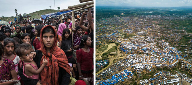 ▲ Con los reflectores en la nueva guerra, otros desplazados por la violencia sólo merecen titulares cuando les llega la muerte, como los que habitan en el campamento de refugiados más grande del mundo creado en 1992 en Bangladesh, donde más de 923 mil personas sobreviven en 194 mil viviendas improvisadas, levantadas con trozos de bambú y plástico, o con láminas, según datos de la ONU. El éxodo se acentuó en 2017, cuando los insurgentes rohingyas atacaron puestos policiacos y militares de Myanmar. Fotos Acnur/ Andrew McConnell y Roger Arnold / Arturo Cano