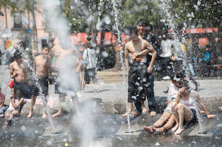 ▲ Alrededor de 20 incendios forestales y de pastizales generaron ayer mala calidad del aire y se sumaron a las altas temperaturas registradas en la Ciudad de México, las cuales seguirán al menos otros seis días y pueden alcanzar 32 grados centígrados, debido a un sistema de presión que impide al viento circular libremente, informan autoridades de Protección Civil; recomiendan a la población hidratarse y usar protector solar. Mientras, la Conafor reportó 58 conflagraciones activas en 21 estados. En la imagen, niños y adultos se refrescan en la Alameda Central; otros se fueron al balneario de Pantitlán. Foto Víctor Camacho / Á. Bolaños, Y. Chio, L. Ramos y A. Valadez