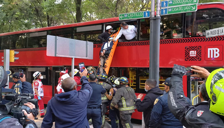 ▲ El percance ocurrió a las 8:10 horas en Paseo de la Reforma y Gandhi cuando el Metrobús de dos pisos estaba detenido; al menos 85 de los lesionados fueron trasladados a hospitales. El conductor de la unidad de la ruta 8, que corre de Chapultepec a Palmas, quien también resultó herido, fue puesto a disposición del Ministerio Público. Foto tomada de Twitter. Laura Gómez y Bertha Teresa Ramírez
