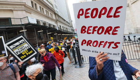 ▲ Cientos de manifestantes protestaron frente a la Bolsa de Valores de Nueva York como antesala de la gran marcha moral nacional en favor de los pobres y trabajadores de bajos ingresos, que se realizará el 18 de junio. La movilización culminó en la iglesia Trinity, la cual preside el reverendo William Barber. Éste declaró que Estados Unidos necesita un trasplante de corazón, ya que casi 140 millones viven en la pobreza. En el cartel se lee: ‘‘la gente antes que ganancias’’. Foto Afp. David Brooks, Corresponsal