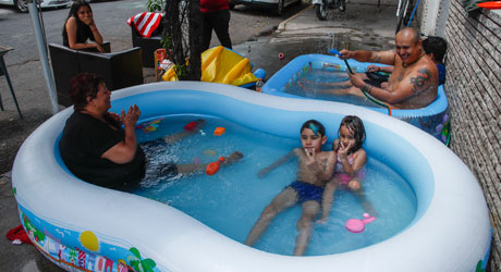 ▲ Por primera ocasión en varios años, no hubo multas cívicas por desperdicio de agua en la vía pública durante un Sábado de Gloria. La Secretaría de Seguridad Ciudadana de la Ciudad de México informó que durante los recorridos por las 16 alcaldías sólo se detectaron personas mojándose en fuentes públicas o albercas inflables, acciones que no se sancionan, como la familia de la imagen, que aprovechó la tradición para refrescarse en un día de intenso calor. Foto Víctor Camacho E. M. Bravo y J. Quintero