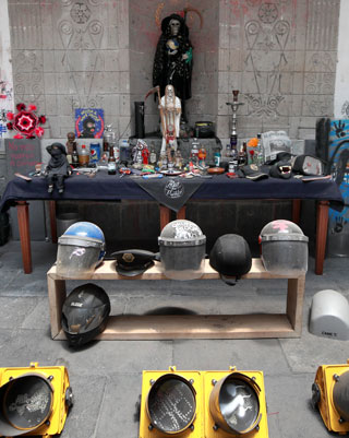 ▲ En un recorrido por el edificio de la CNDH, ubicado en República de Cuba, en el Centro Histórico capitalino, se mostró la manera en que fue transformado por mujeres del llamado Bloque Negro. Los equipos de oficina fueron arrumbados en varios cuartos. También se montó un altar a la Santa Muerte y se colocaron como ofrendas cascos de policías y otros utensilios. Se hallaron cohetones, bombas molotov y mariguana. Foto Alfredo Domínguez