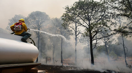 ▲ Más de 60 brigadistas de Conafor, ProBosque y ejidales continúan con el combate al incendio registrado en Almoloya de las Granadas y Tenería, en el municipio de Tejupilco, en la región sur del territorio mexiquense, quienes, con el apoyo de cinco camiones-cisterna, dos ambulancias y un helicóptero Relámpago, reportan hasta el momento 60 por ciento de control del siniestro. Foto Cuartoscuro / Israel Dávila, corresponsal
