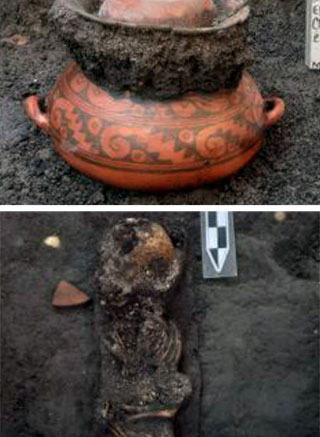▲ Arqueólogos del INAH informaron del descubrimiento de un enterramiento humano, gran cantidad de material cerámico y de una escultura de piedra,
