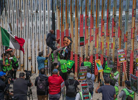 ▲ Migrantes se manifestaron ayer frente al muro fronterizo de Playas de Tijuana, Baja California, en protesta por el llamado Título 42, ordenamiento impuesto por el ex mandatario Donald Trump, el cual les prohíbe entrar a Estados Unidos y solicita a México impedir el paso de centroamericanos en la frontera sur. Consideran que dicha disposición es discriminatoria, debido a que no se aplica a europeos. Foto Omar Martínez / Ana Lilia Ramíres, La Jornada Baja California