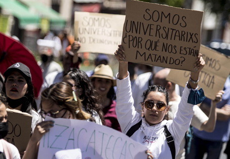 ▲ Cientos de personas, entre familiares, estudiantes y maestros de la Universidad Autónoma de Zacatecas, marcharon ayer por las calles de la capital del estado para demandar el esclarecimiento de los homicidios de Ernesto Mendívil Ortiz (ingeniería), Uzías García Rodríguez (filosofía), Ricardo Rodríguez García (sicología) y Luis González Carrillo (preparatoria). Reclamaron la lentitud de autoridades para abordar el caso y la ineptitud para detener a los responsables. Foto Cuartoscuro. Alfredo Valadez, Corresponsal