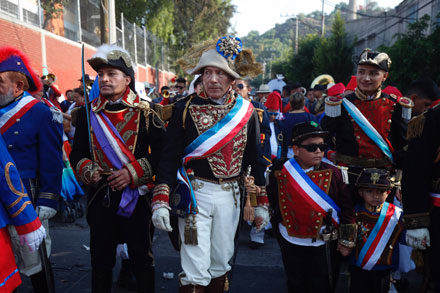 ▲ Pobladores de la colonia Peñón de los Baños, alcaldía Venustiano Carranza, escenificaron la gesta en la que el Ejército Mexicano, con el apoyo de indígenas zacapoaxtlas, venció a las fuerzas francesas, consideradas entonces las más poderosas del mundo. Claudia Sheinbaum, jefa de Gobierno capitalino, presenció los festejos y anunció que se impulsará que la recreación de la Batalla de Puebla, ocurrida el 5 de mayo de 1862, sea declarada patrimonio cultural de la Ciudad de México. Foto Cristina Rodríguez. / Alejandro Cruz y Elba Bravo