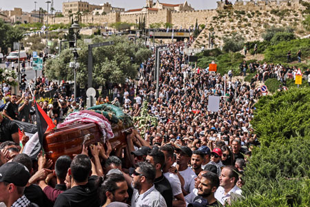 ▲ Antes del funeral de la comunicadora palestino-estadunidense Shireen Abu Akleh, abatida durante una operación militar israelí, decenas de personas trataron de marchar con el féretro desde el hospital hasta una iglesia católica, pero la policía irrumpió y golpeó a los manifestantes con garrotes, por lo que el ataúd de la estrella de Al Jazeera cayó brevemente al suelo. Las imágenes de televisión que muestran a soldados israelíes azotando a quienes llevaban los restos mortales causaron consternación en el mundo. El saldo de la represión al cortejo fúnebre fue de 33 heridos, seis de los cuales fueron hospitalizados. Foto Afp / Afp, Ap y Xinhua