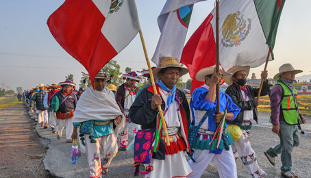 ▲ Pobladores de San Sebastián Tepenahuaxtla, Jalisco, quienes partieron hacia la Ciudad de México el 23 de abril para pedir la intervención del presidente Andrés Manuel López Obrador en la resolución de añejo conflicto agrario, arribaron ayer a Ixtlahuaca. Demandan la restitución de 11 mil hectáreas invadidas por ganaderos y talamontes. Se prevé que hoy lleguen a Toluca. Foto Cuartoscuro