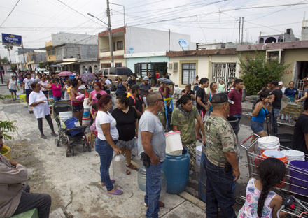 ▲ Largas filas forman los habitantes del municipio de Escobedo, en la zona metropolitana de Monterrey, para que las pipas que envía el gobierno local les llenen sus recipientes. La crisis hídrica que padece esa región neoleonesa se ha agudizado. Los esfuerzos de Servicios de Agua y Drenaje de la localidad para paliar el desabasto han sido hasta el momento insuficientes. Foto Cuartoscuro