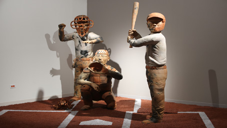 ▲ La sede de los Diablos Rojos del México tiene 14 salas en las que se cuentan los 82 años de la historia del equipo y dos para muestras temporales. Hoy aloja la inédita exposición Francisco Toledo: Sobre beisbol, la cual cuenta con 70 piezas del maestro juchiteco. María Isabel Grañén Porrúa narró la amistad del artista con la familia Harp Helú y cómo se vinculó el artista con la creación del recinto. En la imagen, peloteros de tamaño real realizados por Víctor Vázquez. Foto José Antonio López. M. Mateos-Vega, P. Espinosa y J. Vázquez