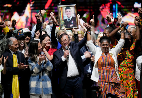 ▲ Gustavo Petro festeja en Bogotá con su familia y simpatizantes la victoria electoral, al tiempo que toma de la mano a Francia Márquez, quien será la vicepresidenta de Colombia. El también senador ofreció transformar la crisis del país dejando atrás el odio e impulsando el amor, sin hacer a un lado el capitalismo. Su oponente, el millonario Rodolfo Hernández, reconoció su derrota. Durante el discurso del político triunfante, la madre de Dylan Cruz, joven asesinado en una protesta, mostró su fotografía. Foto Ap