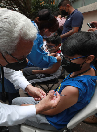 ▲ Desde temprana hora, padres de niños de 10 y 11 años formaron ayer filas en los 39 centros de vacunación en la Ciudad de México para inmunizar a sus hijos contra el covid-19. La inoculación continuará las próximas semanas hasta los menores de cinco años. Era común escuchar la frase
